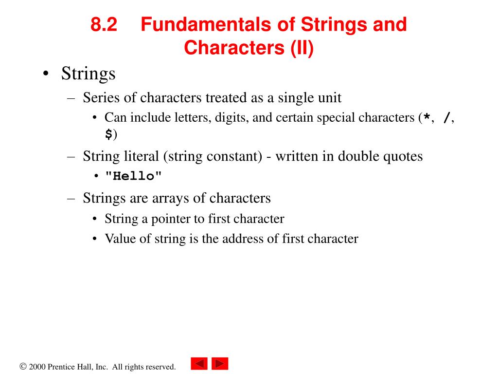 8.2 Fundamentals of Strings and Characters (II) • Strings • Series of characters treated as a single unit • Can include letters, digits, and certain special characters (*, /, $) • String literal (string constant) - written in double quotes • "Hello" • Strings are arrays of characters • String a pointer to first character • Value of string is the address of first character