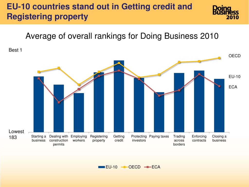 EU-10 countries stand out in Getting credit and Registering property Average of overall rankings for Doing Business 2010 Best 1 Lowest 183 OECD EU-10 ECA