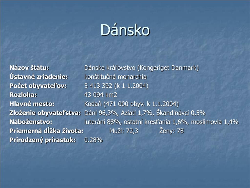 Dánsko Názov štátu: Dánske kráľovstvo (Kongeriget Danmark) Ústavné zriadenie: konštitučná monarchia Počet obyvateľov: 5 413 392 (k 1.1.2004) Rozloha: 43 094 km2 Hlavné mesto: Kodaň (471 000 obyv. k 1.1.2004) Zloženie obyvateľstva: Dáni 96,3%, Aziati 1,7%, Škandinávci 0,5% Náboženstvo: luteráni 88%, ostatní kresťania 1,6%, moslimovia 1,4% Priemerná dĺžka života: Muži: 72,3 Ženy: 78 Prirodzený prírastok: 0.28%