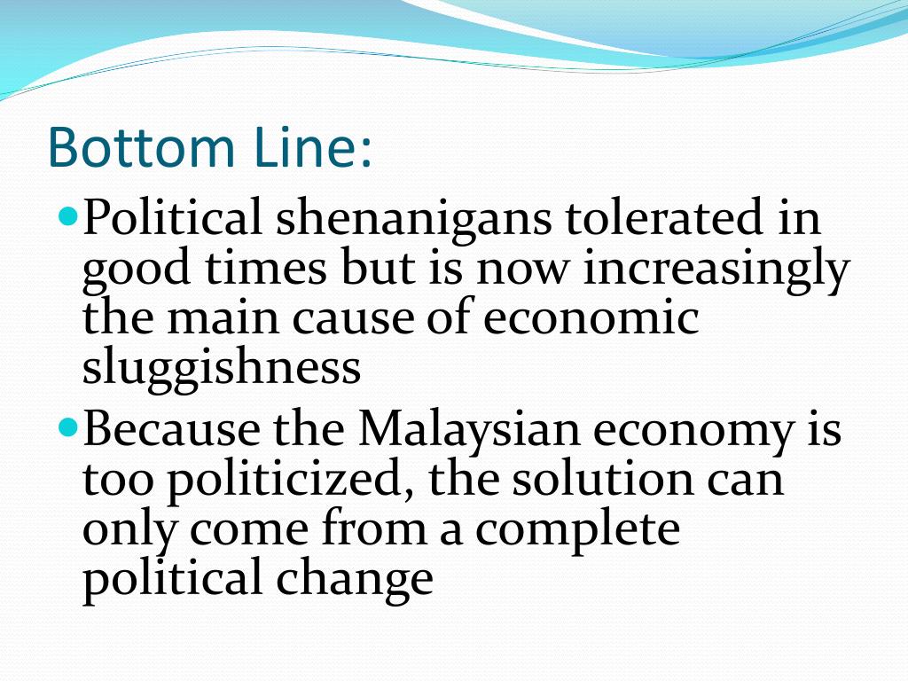 Bottom Line: • Political shenanigans tolerated in good times but is now increasingly the main cause of economic sluggishness • Because the Malaysian economy is too politicized, the solution can only come from a complete political change