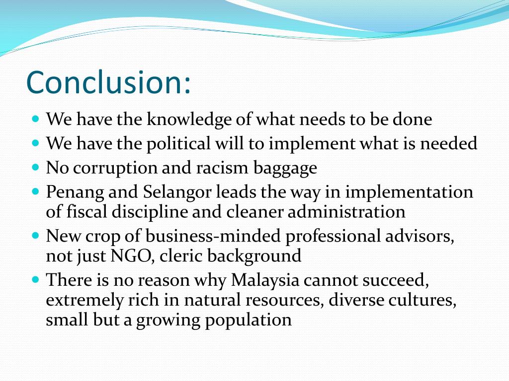 Conclusion: • We have the knowledge of what needs to be done • We have the political will to implement what is needed • No corruption and racism baggage • Penang and Selangor leads the way in implementation of fiscal discipline and cleaner administration • New crop of business-minded professional advisors, not just NGO, cleric background • There is no reason why Malaysia cannot succeed, extremely rich in natural resources, diverse cultures, small but a growing population