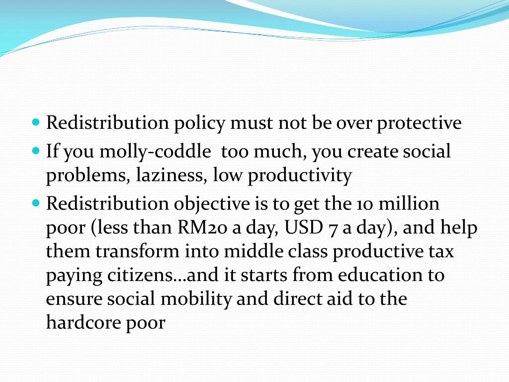 Redistribution policy must not be over protective • If you molly-coddle too much, you create social problems, laziness, low productivity • Redistribution objective is to get the 10 million poor (less than RM20 a day, USD 7 a day), and help them transform into middle class productive tax paying citizens…and it starts from education to ensure social mobility and direct aid to the hardcore poor