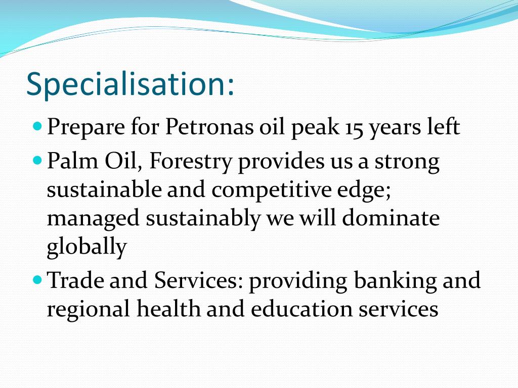 Specialisation: • Prepare for Petronas oil peak 15 years left • Palm Oil, Forestry provides us a strong sustainable and competitive edge; managed sustainably we will dominate globally • Trade and Services: providing banking and regional health and education services