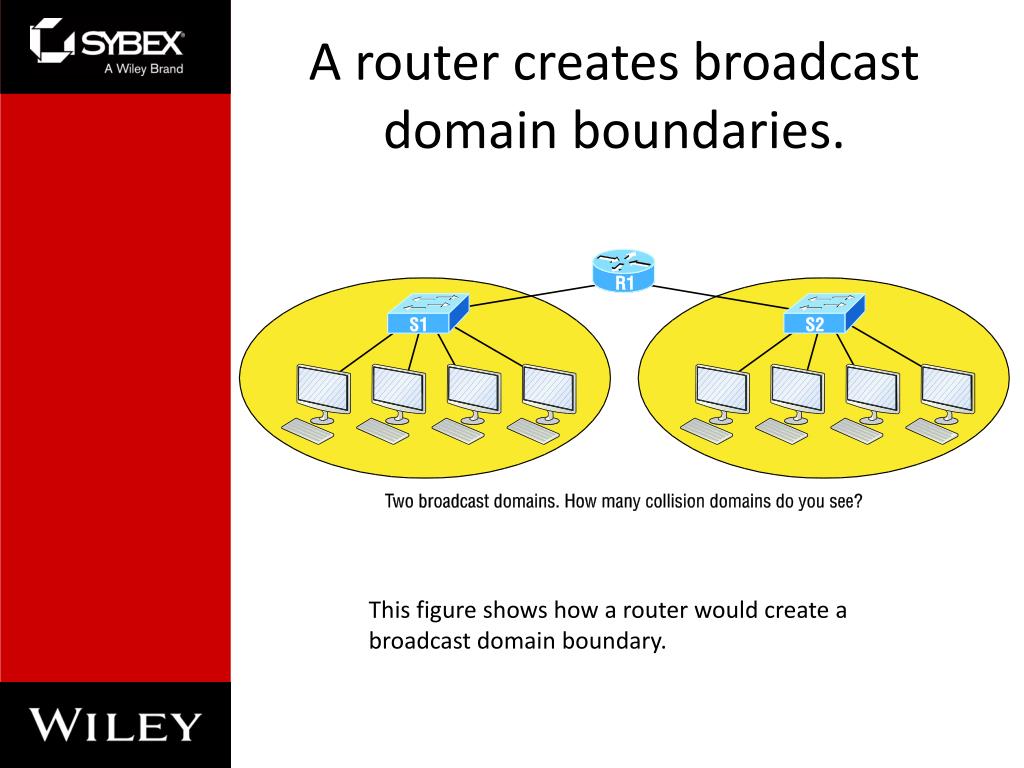 A router creates broadcast domain boundaries. This figure shows how a router would create a broadcast domain boundary.
