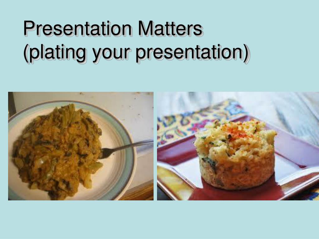 Your team members are “ingredients,” too. • Different strengths and weaknesses • Different roles • Varied expertise • Different faces, paces, voices, and styles! • Skits and other creative techniques more feasible And yet— It’s ONE presentation.