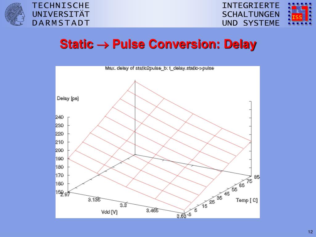 Static Pulse Conversion: Transistor Level Data input has to be stable during evaluation time teval after rising edge ofclka or clkb Pulse width is defined by feedback path of SRCMOS Generates pulse according to data input after rising edge of clka or clkb