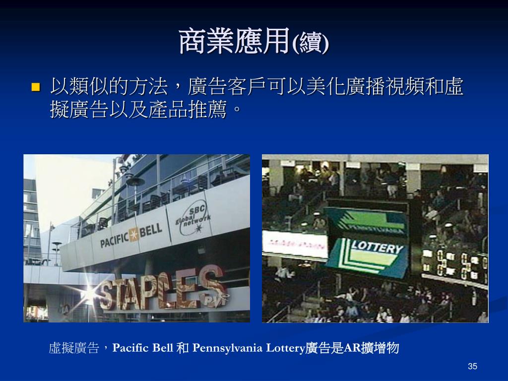商業應用(續) 虛擬廣告,Pacific Bell 和 Pennsylvania Lottery廣告是AR擴增物 以類似的方法,廣告客戶可以美化廣播視頻和虛擬廣告以及產品推薦。