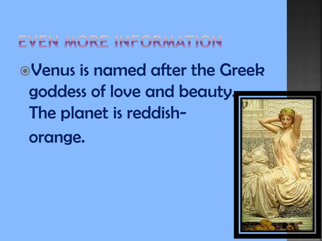 Even more information • Venus is named after the Greek goddess of love and beauty. The planet is reddish- orange.
