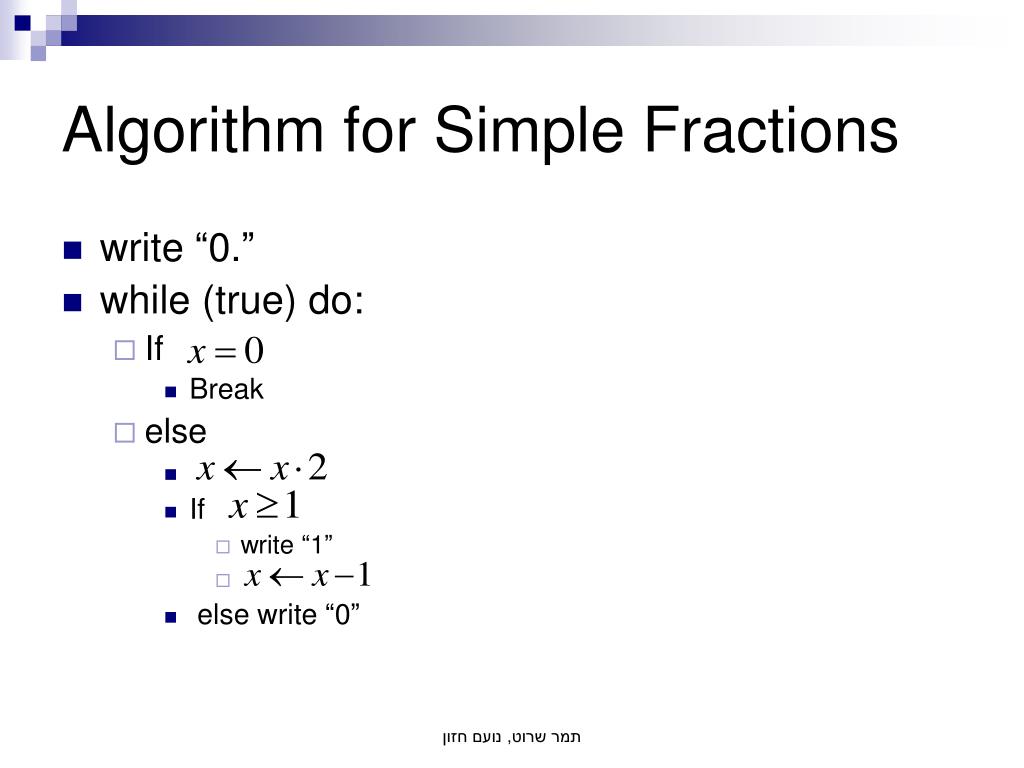 Algorithm for Simple Fractions • write “0.” • while (true) do: • If • Break • else • If • write “1” • else write “0” תמר שרוט, נועם חזון