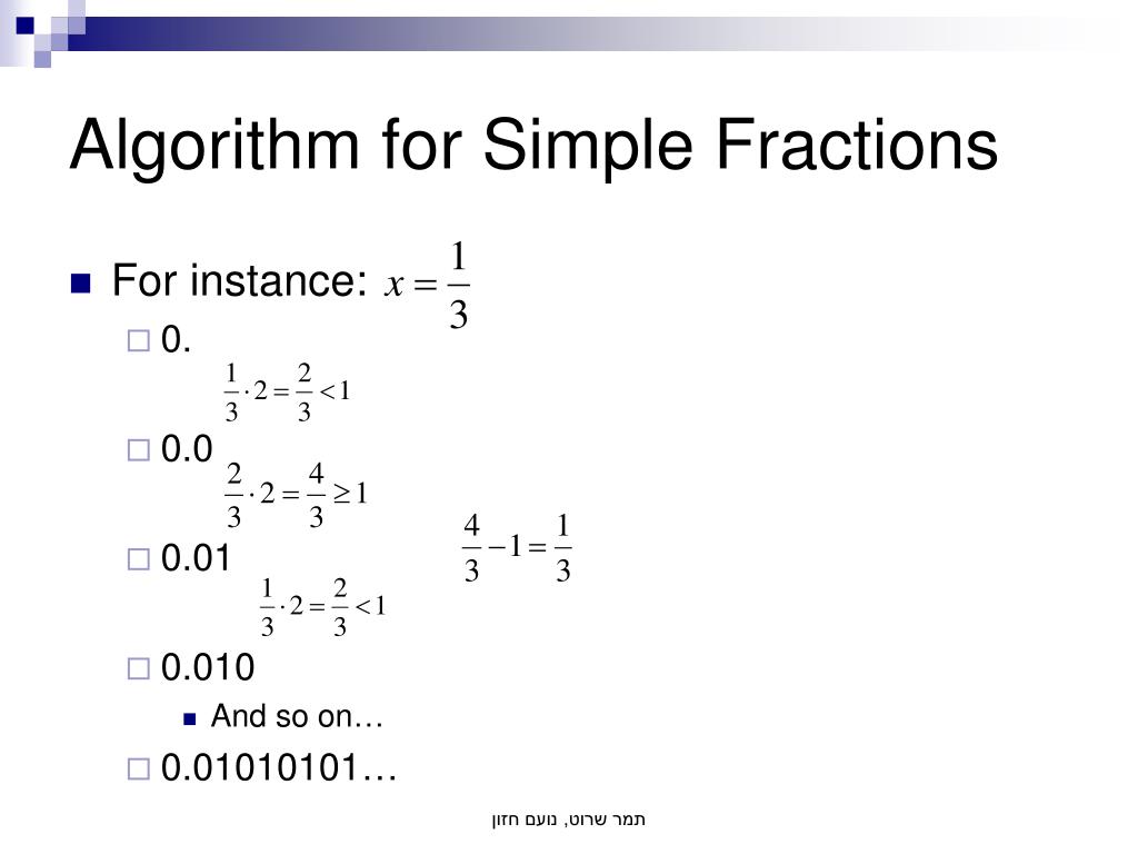 Algorithm for Simple Fractions • For instance: • 0. • 0.0 • 0.01 • 0.010 • And so on… • 0.01010101… תמר שרוט, נועם חזון