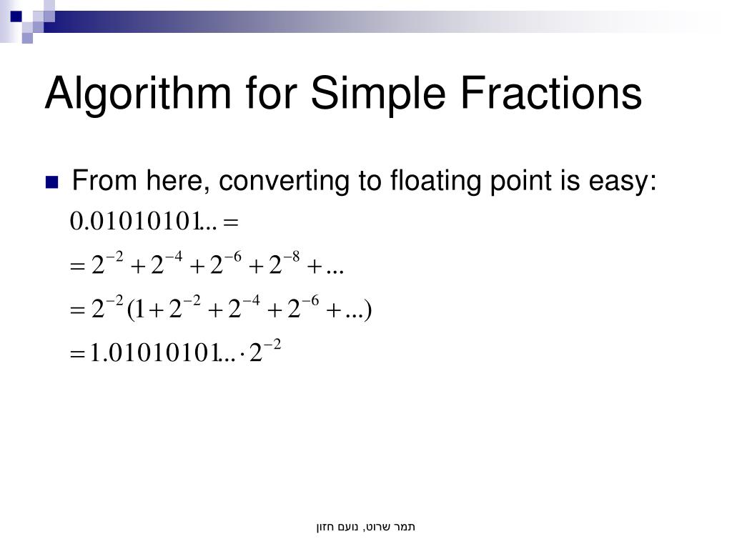 Algorithm for Simple Fractions • From here, converting to floating point is easy: תמר שרוט, נועם חזון