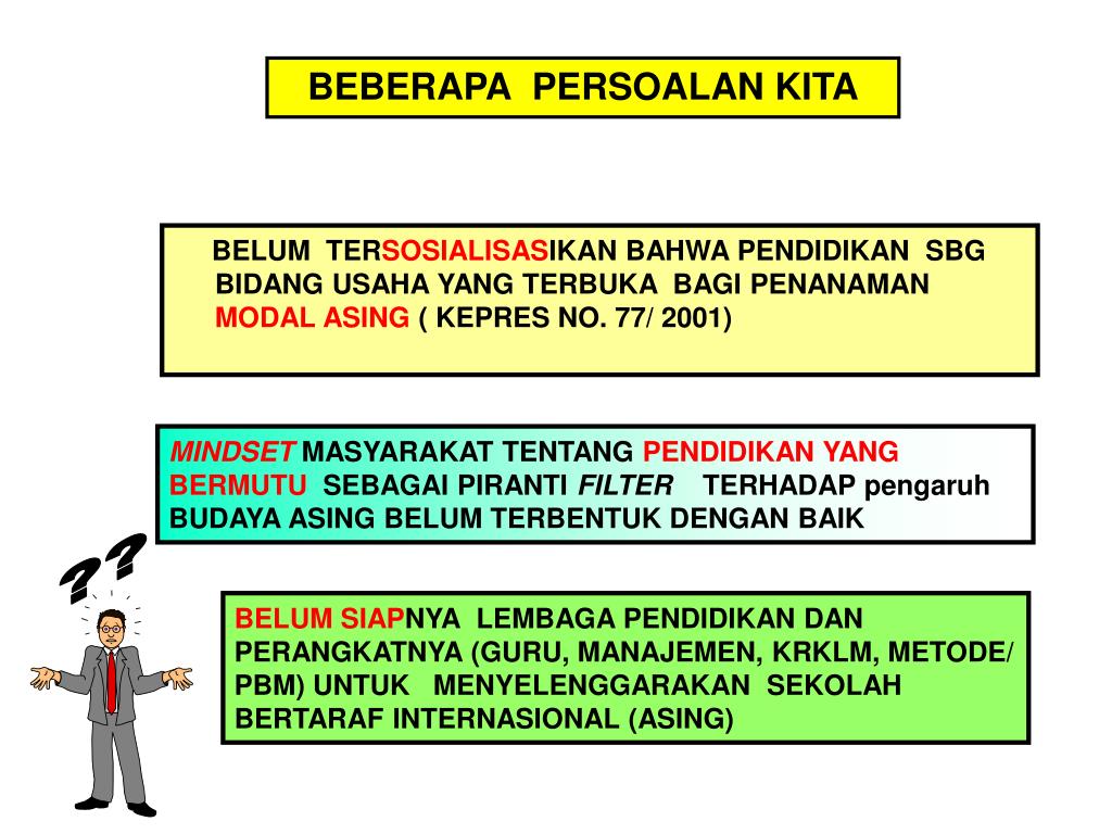 ?? BEBERAPA PERSOALAN KITA BELUM TERSOSIALISASIKAN BAHWA PENDIDIKAN SBG BIDANG USAHA YANG TERBUKA BAGI PENANAMAN MODAL ASING ( KEPRES NO. 77/ 2001) MINDSET MASYARAKAT TENTANG PENDIDIKAN YANG BERMUTU SEBAGAI PIRANTI FILTER TERHADAP pengaruh BUDAYA ASING BELUM TERBENTUK DENGAN BAIK BELUM SIAPNYA LEMBAGA PENDIDIKAN DAN PERANGKATNYA (GURU, MANAJEMEN, KRKLM, METODE/ PBM) UNTUK MENYELENGGARAKAN SEKOLAH BERTARAF INTERNASIONAL (ASING)