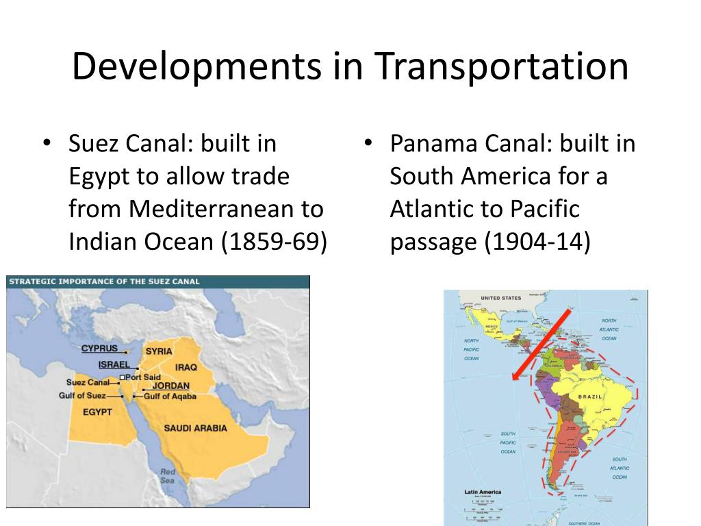 Developments in Transportation • Suez Canal: built in Egypt to allow trade from Mediterranean to Indian Ocean (1859-69) • Panama Canal: built in South America for a Atlantic to Pacific passage (1904-14)