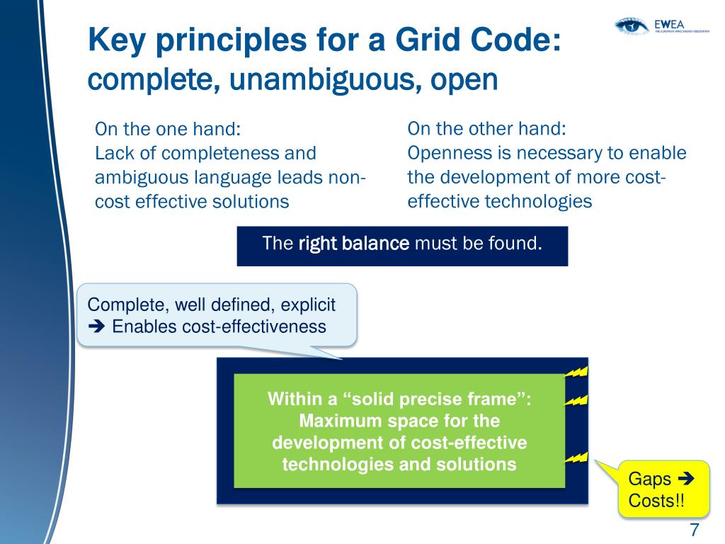 Key principles for a Grid Code: complete, unambiguous, open On the other hand: Openness is necessary to enable the development of more cost-effective technologies On the one hand: Lack of completeness and ambiguous language leads non-cost effective solutions The right balance must be found. Complete, well defined, explicit Enables cost-effectiveness Within a “solid precise frame”: Maximum space for the development of cost-effective technologies and solutions Gaps Costs!!