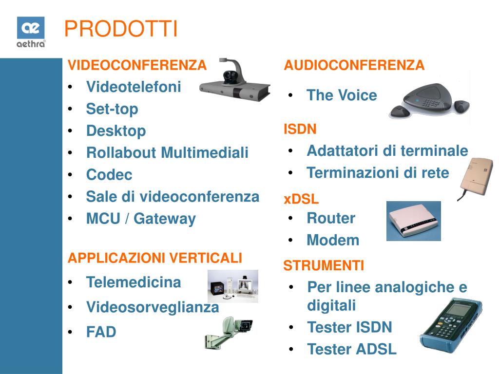 PRODOTTI VIDEOCONFERENZA AUDIOCONFERENZA • Videotelefoni • Set-top • Desktop • Rollabout Multimediali • Codec • Sale di videoconferenza • MCU / Gateway • The Voice ISDN • Adattatori di terminale • Terminazioni di rete xDSL • Router • Modem APPLICAZIONI VERTICALI STRUMENTI • Telemedicina • Per linee analogiche e digitali • Tester ISDN • Tester ADSL • Videosorveglianza • FAD