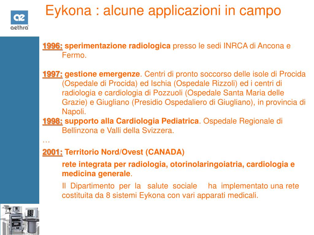 Eykona : alcune applicazioni in campo 1996:sperimentazione radiologica presso le sedi INRCA di Ancona e Fermo. 1997:gestione emergenze. Centri di pronto soccorso delle isole di Procida (Ospedale di Procida) ed Ischia (Ospedale Rizzoli) ed i centri di radiologia e cardiologia di Pozzuoli (Ospedale Santa Maria delle Grazie) e Giugliano (Presidio Ospedaliero di Giugliano), in provincia di Napoli. 1998:supporto alla Cardiologia Pediatrica. Ospedale Regionale di Bellinzona e Valli della Svizzera. … 2001:Territorio Nord/Ovest (CANADA) rete integrata per radiologia, otorinolaringoiatria, cardiologia e medicina generale. Il Dipartimento per la salute sociale ha implementato una rete costituita da 8 sistemi Eykona con vari apparati medicali.