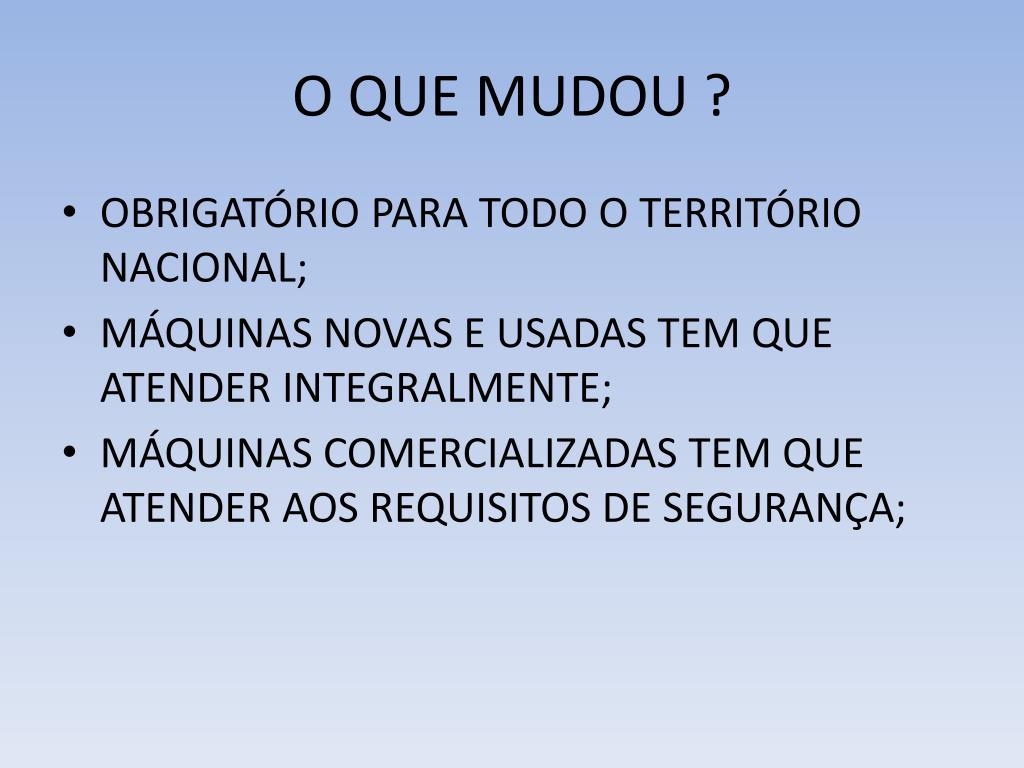 O QUE MUDOU ? • OBRIGATÓRIO PARA TODO O TERRITÓRIO NACIONAL; • MÁQUINAS NOVAS E USADAS TEM QUE ATENDER INTEGRALMENTE; • MÁQUINAS COMERCIALIZADAS TEM QUE ATENDER AOS REQUISITOS DE SEGURANÇA;