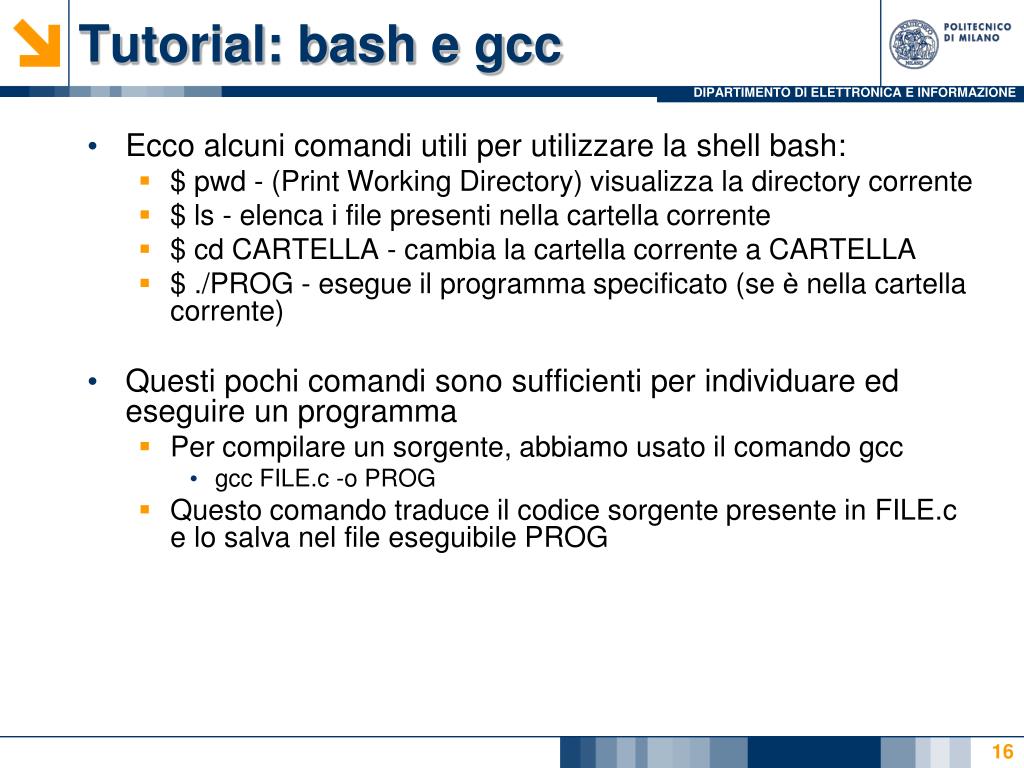 Tutorial: bash e gcc • Ecco alcuni comandi utili per utilizzare la shellbash: • $ pwd - (PrintWorking Directory) visualizza la directory corrente • $ ls - elenca i file presenti nella cartella corrente • $ cd CARTELLA - cambia la cartella corrente a CARTELLA • $ ./PROG - esegue il programma specificato (se è nella cartella corrente) • Questi pochi comandi sono sufficienti per individuare ed eseguire un programma • Per compilare un sorgente, abbiamo usato il comando gcc • gccFILE.c -o PROG • Questo comando traduce il codice sorgente presente in FILE.c e lo salva nel file eseguibile PROG