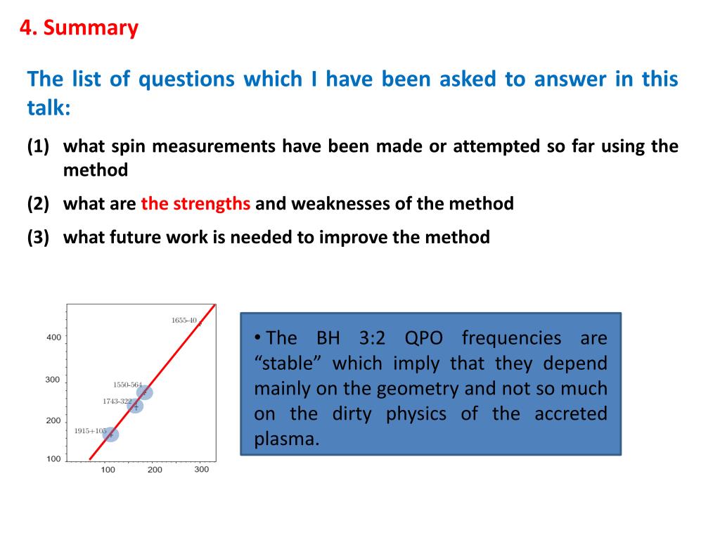 4. Summary The list of questions which I have been asked to answer in this talk: what spin measurements have been made or attempted so far using the method what are the strengths and weaknesses of the method what future work is needed to improve the method • The BH 3:2 QPO frequencies are “stable” which imply that they depend mainly on the geometry and not so much on the dirty physics of the accreted plasma.