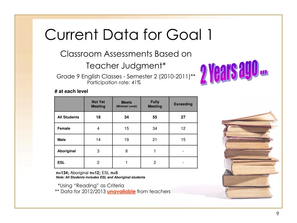 Current Data for Goal 1 Classroom Assessments Based on Teacher Judgment* Grade 9 English Classes - Semester 2 (2010-2011)** 2 Years ago ... Participation rate: 41% # at each level n=134; Aboriginal n=12; ESL n=5 Note: All Students includes ESL and Aboriginal students *Using “Reading” as Criteria ** Data for 2012/2013 unavailable from teachers