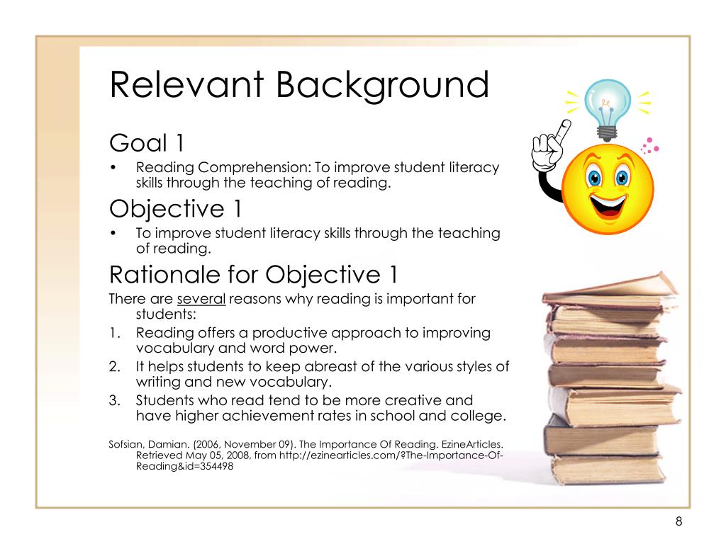 Relevant Background Goal 1 • Reading Comprehension: To improve student literacy skills through the teaching of reading. Objective 1 • To improve student literacy skills through the teaching of reading. Rationale for Objective 1 There are several reasons why reading is important for students: • Reading offers a productive approach to improving vocabulary and word power. • It helps students to keep abreast of the various styles of writing and new vocabulary. • Students who read tend to be more creative and have higher achievement rates in school and college. Sofsian, Damian. (2006, November 09). The Importance Of Reading. EzineArticles. Retrieved May 05, 2008, from http://ezinearticles.com/?The-Importance-Of-Reading&id=354498