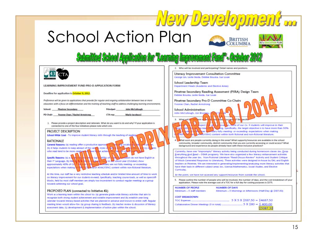 New Development ... School Action Plan Submitted School Application for "Learning Improvement Fund" - October 2012 WILL RE-APPLY FOR 2013 / 2014