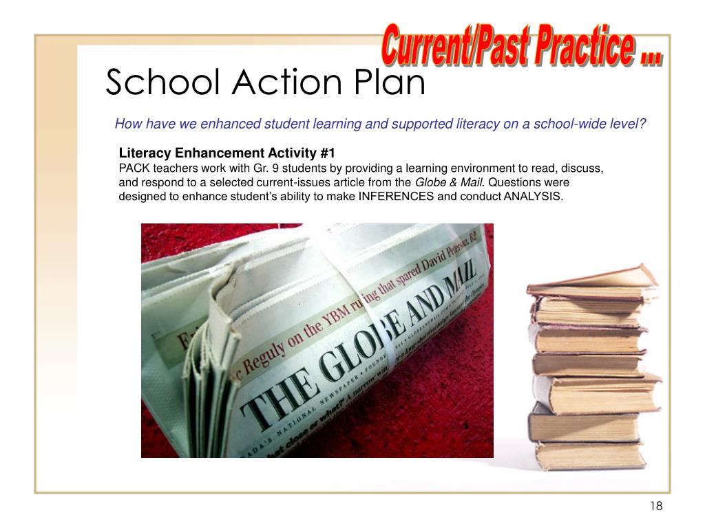 School Action Plan Current/Past Practice ... How have we enhanced student learning and supported literacy on a school-wide level? Literacy Enhancement Activity #1 PACK teachers work with Gr. 9 students by providing a learning environment to read, discuss, and respond to a selected current-issues article from the Globe & Mail. Questions were designed to enhance student’s ability to make INFERENCES and conduct ANALYSIS.