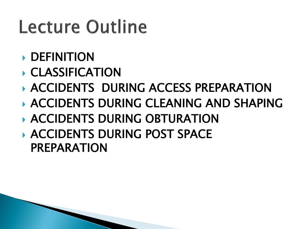 Lecture Outline • DEFINITION • CLASSIFICATION • ACCIDENTS DURING ACCESS PREPARATION • ACCIDENTS DURING CLEANING AND SHAPING • ACCIDENTS DURING OBTURATION • ACCIDENTS DURING POST SPACE PREPARATION
