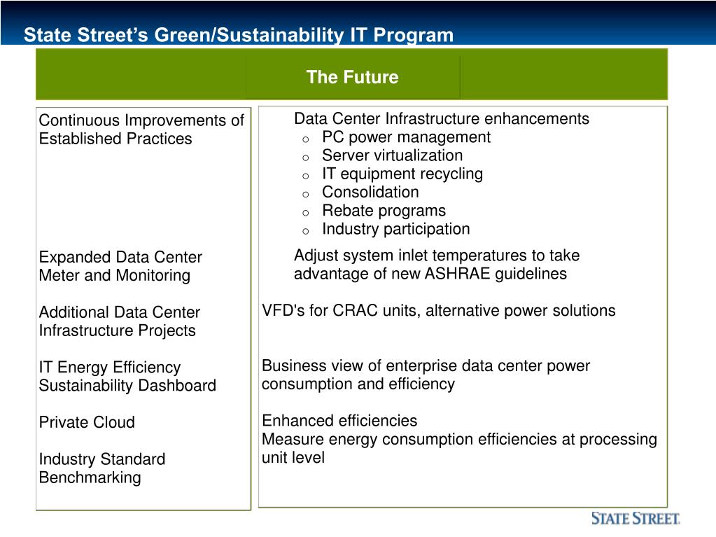 State Street’s Green/Sustainability IT Program The Future • Data Center Infrastructure enhancements • PC power management • Server virtualization • IT equipment recycling • Consolidation • Rebate programs • Industry participation • Adjust system inlet temperatures to take • advantage of new ASHRAE guidelines • VFD's for CRAC units, alternative power solutions • Business view of enterprise data center power consumption and efficiency • Enhanced efficiencies • Measure energy consumption efficiencies at processing unit level Continuous Improvements of Established Practices Expanded Data Center Meter and Monitoring Additional Data Center Infrastructure Projects IT Energy Efficiency Sustainability Dashboard Private Cloud Industry Standard Benchmarking