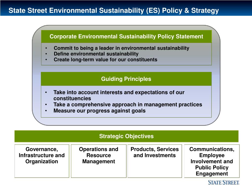 State Street Environmental Sustainability (ES) Policy & Strategy Corporate Environmental Sustainability Policy Statement • Commit to being a leader in environmental sustainability • Define environmental sustainability • Create long-term value for our constituents Guiding Principles • Take into account interests and expectations of our constituencies • Take a comprehensive approach in management practices • Measure our progress against goals Strategic Objectives Governance, Infrastructure and Organization Operations and Resource Management Products, Services and Investments Communications, Employee Involvement and Public Policy Engagement