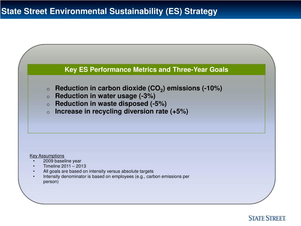 State Street Environmental Sustainability (ES) Strategy Key ES Performance Metrics and Three-Year Goals • Reduction in carbon dioxide (CO2) emissions (-10%) • Reduction in water usage (-3%) • Reduction in waste disposed (-5%) • Increase in recycling diversion rate (+5%) • Key Assumptions • 2009 baseline year • Timeline 2011 – 2013 • All goals are based on intensity versus absolute targets • Intensity denominator is based on employees (e.g., carbon emissions per person)