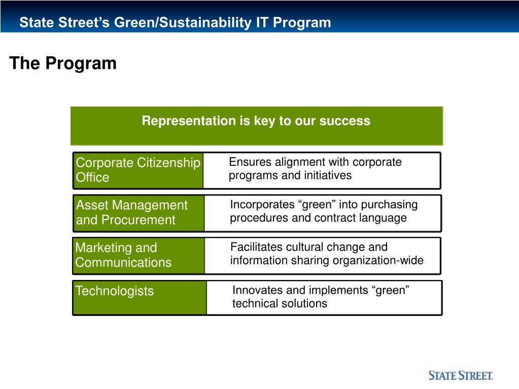 State Street’s Green/Sustainability IT Program The Program Representation is key to our success Corporate Citizenship Office • Ensures alignment with corporate programs and initiatives Asset Management and Procurement • Incorporates “green” into purchasing procedures and contract language Marketing and Communications • Facilitates cultural change and information sharing organization-wide Technologists • Innovates and implements “green” technical solutions