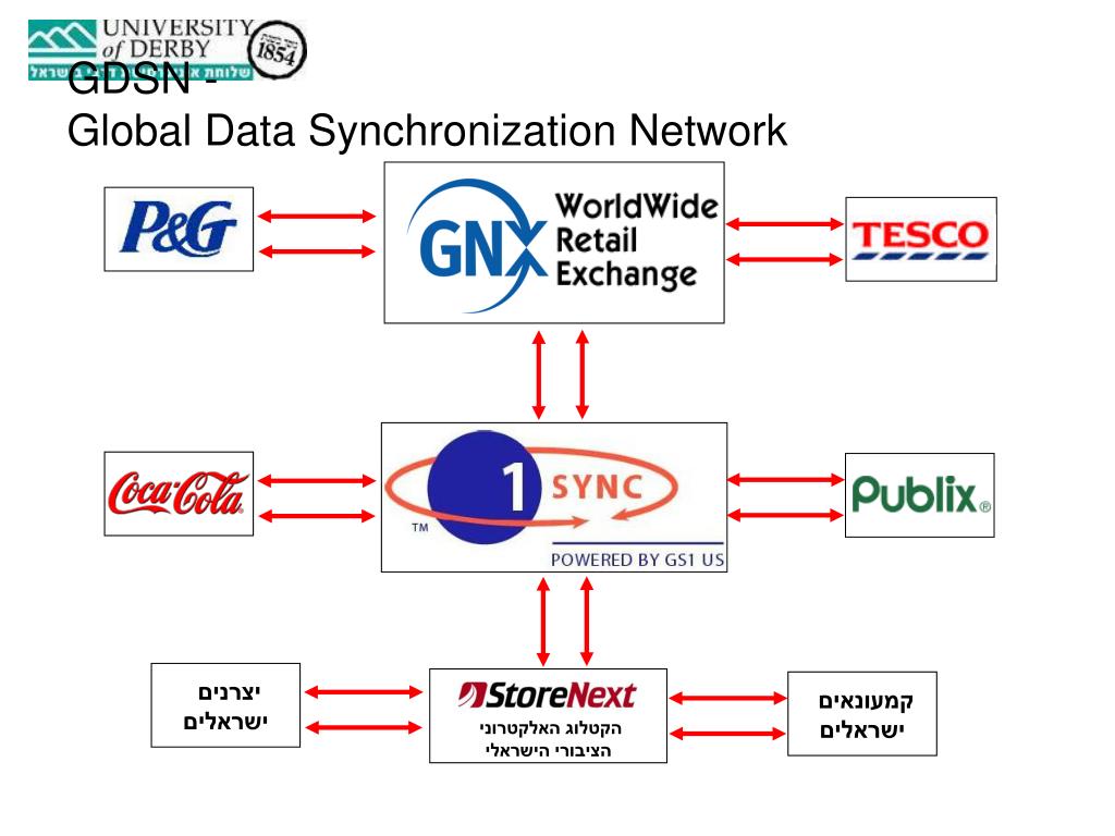 7. פיתוח מוצרים 6. תכנון מכירות ומבצעים 5. ניהול שרשרת האספקה 4. ניהול הסחר 3. סינכרון נתונים 2. קטלוג מרכזי ארצי 1. סטנדרטים לנתונים סינכרון נתונים • שותפי הסחר סופגים כיום עלויות מיותרות בגלל מידע משובש או חסר על הפריטים בשרשרת האספקה. • סינכרון נתונים בין מערכות המידע של שותפי הסחר מבטיח שהנתונים בכל המערכות תמיד זהים. • סינכרון נתונים גלובלי (GDS) הופך להכרח בסחר בינלאומי. • סינכרון נתונים מאפשר ניצול יעיל של טכנולוגיית RFID.