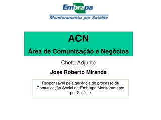 ACN Área de Comunicação e Negócios. Chefe-Adjunto José Roberto Miranda. Responsável pela gerência do processo de Comunicação Social na Embrapa Monitoramento por Satélite. ACN - Área de Comunicação e Negócios. Estruturada em 2 focos diferentes:. FOCOS. INTERNO. EXTERNO.