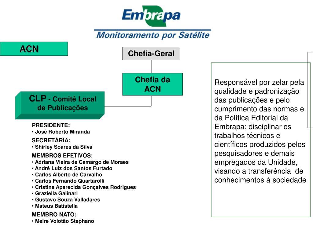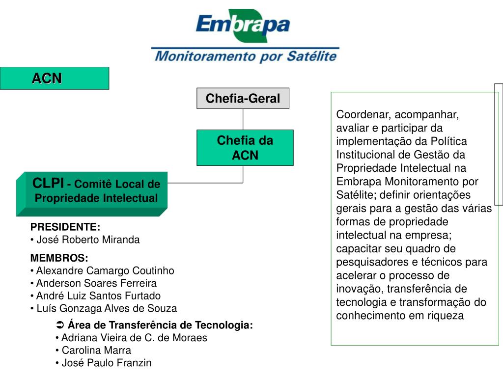 ACN Chefia-Geral Coordenar, acompanhar, avaliar e participar da implementação da Política Institucional de Gestão da Propriedade Intelectual na Embrapa Monitoramento por Satélite; definir orientações gerais para a gestão das várias formas de propriedade intelectual na empresa; capacitar seu quadro de pesquisadores e técnicos para acelerar o processo de inovação, transferência de tecnologia e transformação do conhecimento em riqueza Chefia da ACN CLPI - Comitê Local de Propriedade Intelectual • PRESIDENTE: • José Roberto Miranda • MEMBROS: • Alexandre Camargo Coutinho • Anderson Soares Ferreira • André Luiz Santos Furtado • Luís Gonzaga Alves de Souza • Área de Transferência de Tecnologia: • Adriana Vieira de C. de Moraes • Carolina Marra • José Paulo Franzin