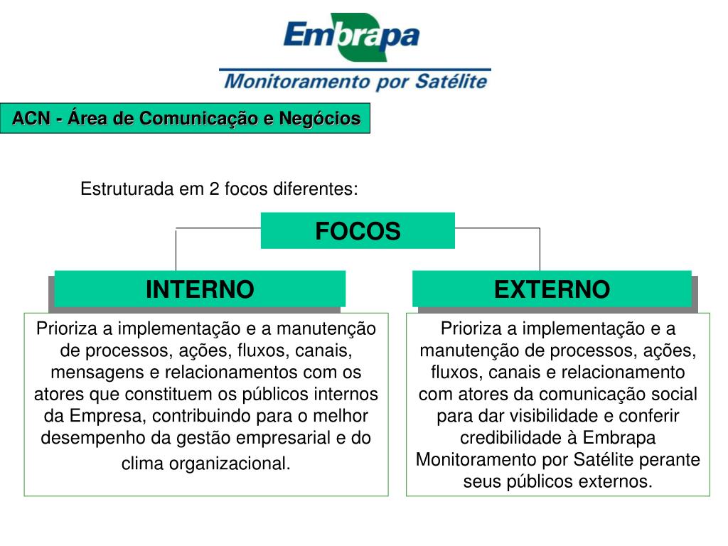 ACN - Área de Comunicação e Negócios Estruturada em 2 focos diferentes: FOCOS INTERNO EXTERNO Prioriza a implementação e a manutenção de processos, ações, fluxos, canais, mensagens e relacionamentos com os atores que constituem os públicos internos da Empresa, contribuindo para o melhor desempenho da gestão empresarial e do clima organizacional. Prioriza a implementação e a manutenção de processos, ações, fluxos, canais e relacionamento com atores da comunicação social para dar visibilidade e conferir credibilidade à Embrapa Monitoramento por Satélite perante seus públicos externos.