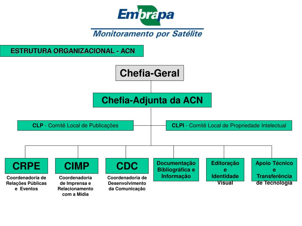ESTRUTURA ORGANIZACIONAL - ACN Chefia-Geral Chefia-Adjunta da ACN CLP - Comitê Local de Publicações CLPI - Comitê Local de Propriedade Intelectual CRPE CIMP CDC Documentação Bibliográfica e Informação Editoração e Identidade Visual Apoio Técnico e Transferência de Tecnologia Coordenadoria de Relações Públicas e Eventos Coordenadoria de Imprensa e Relacionamento com a Mídia Coordenadoria de Desenvolvimento da Comunicação