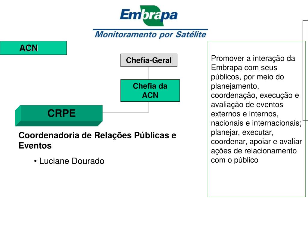 ACN Promover a interação da Embrapa com seus públicos, por meio do planejamento, coordenação, execução e avaliação de eventos externos e internos, nacionais e internacionais;planejar, executar, coordenar, apoiar e avaliar ações de relacionamento com o público Chefia-Geral Chefia da ACN CRPE • Coordenadoria de Relações Públicas e Eventos • Luciane Dourado