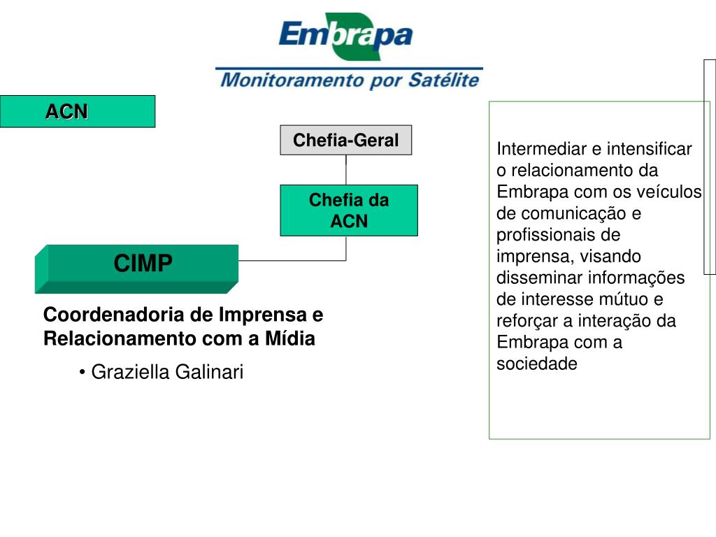 ACN Intermediar e intensificar o relacionamento da Embrapa com os veículos de comunicação e profissionais de imprensa, visando disseminar informações de interesse mútuo e reforçar a interação da Embrapa com a sociedade Chefia-Geral Chefia da ACN CIMP • Coordenadoria de Imprensa e Relacionamento com a Mídia • Graziella Galinari