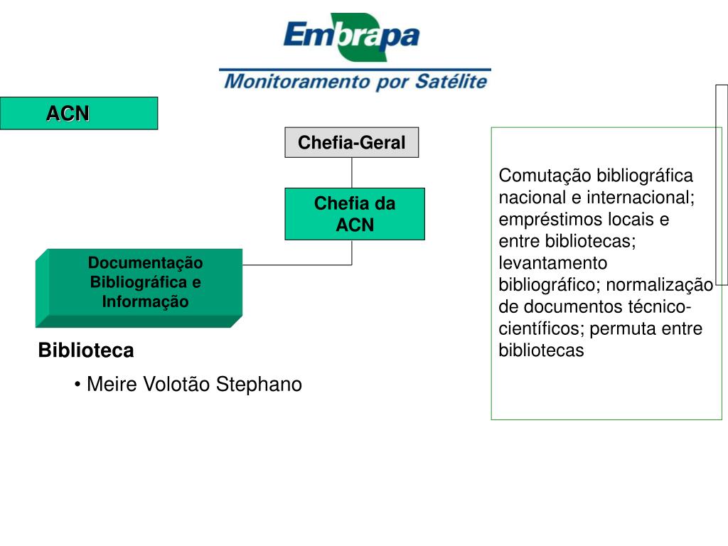 ACN Chefia-Geral Comutação bibliográfica nacional e internacional; empréstimos locais e entre bibliotecas; levantamento bibliográfico; normalização de documentos técnico-científicos; permuta entre bibliotecas Chefia da ACN Documentação Bibliográfica e Informação • Biblioteca • Meire Volotão Stephano