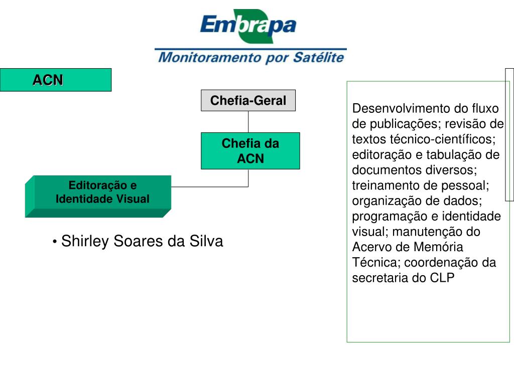 ACN Desenvolvimento do fluxo de publicações; revisão de textos técnico-científicos; editoração e tabulação de documentos diversos; treinamento de pessoal; organização de dados; programação e identidade visual; manutenção do Acervo de Memória Técnica; coordenação da secretaria do CLP Chefia-Geral Chefia da ACN Editoração e Identidade Visual • Shirley Soares da Silva