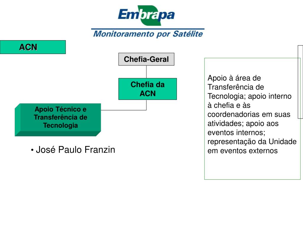 ACN Chefia-Geral Apoio à área de Transferência de Tecnologia; apoio interno à chefia e às coordenadorias em suas atividades; apoio aos eventos internos; representação da Unidade em eventos externos Chefia da ACN Apoio Técnico e Transferência de Tecnologia • José Paulo Franzin