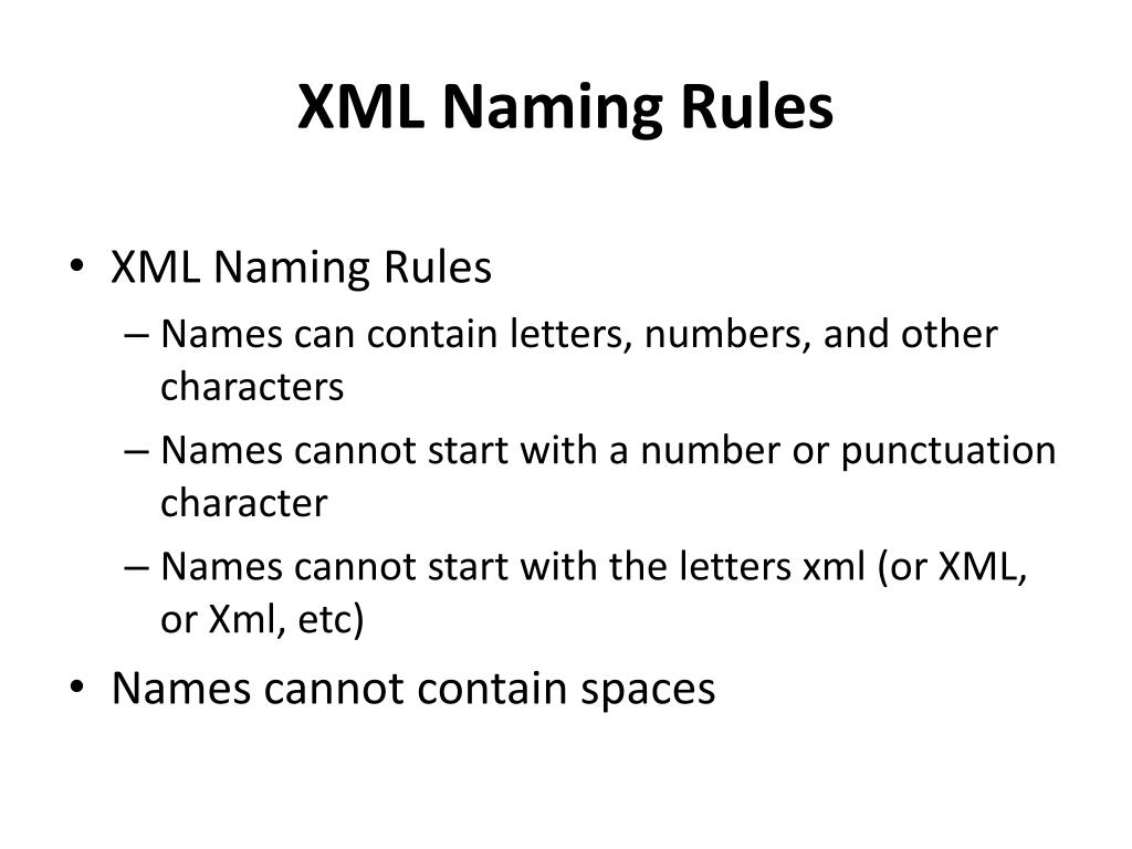 XML NamingRules • XML Naming Rules • Names can contain letters, numbers, and other characters • Names cannot start with a number or punctuation character • Names cannot start with the letters xml (or XML, or Xml, etc) • Names cannot contain spaces