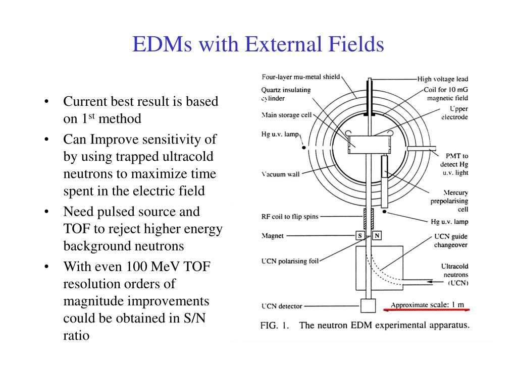 Current best result is based on 1st method Can Improve sensitivity of by using trapped ultracold neutrons to maximize time spent in the electric field Need pulsed source and TOF to reject higher energy background neutrons With even 100 MeV TOF resolution orders of magnitude improvements could be obtained in S/N ratio EDMs with External Fields