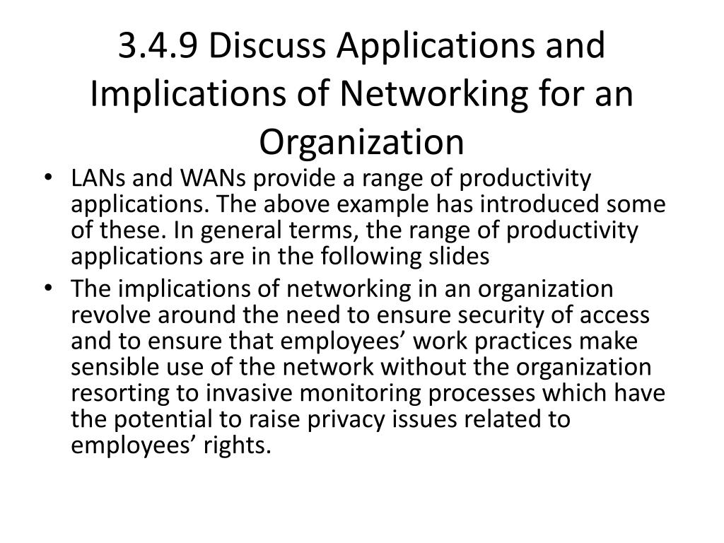 3.4.9 Discuss Applications and Implications of Networking for an Organization • LANs and WANs provide a range of productivity applications. The above example has introduced some of these. In general terms, the range of productivity applications are in the following slides • The implications of networking in an organization revolve around the need to ensure security of access and to ensure that employees’ work practices make sensible use of the network without the organization resorting to invasive monitoring processes which have the potential to raise privacy issues related to employees’ rights.