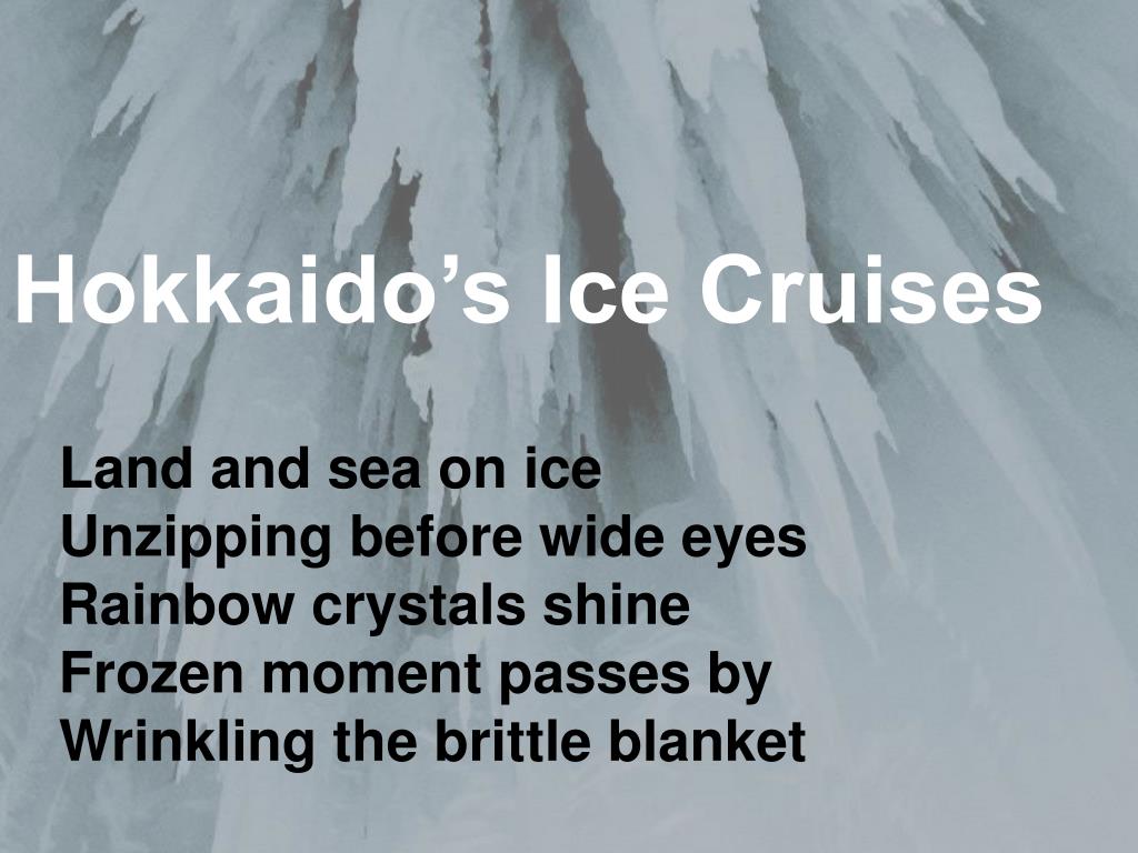 Hokkaido’s Ice Cruises. Land and sea on ice Unzipping before wide eyes Rainbow crystals shine Frozen moment passes by Wrinkling the brittle blanket.
