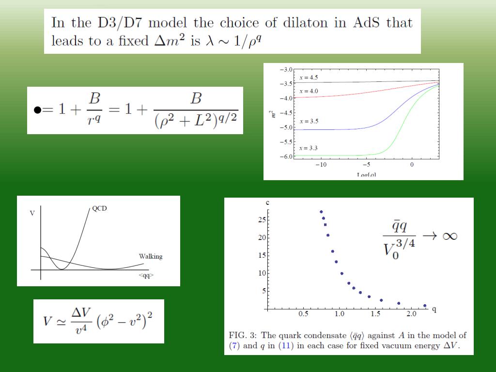 Walking Dynamics Such theories probably exist … Cf Banks Zak Seiberg N=1 SUSY duality Such theories have enhanced UV quark condensate Constructing gravity duals of such theories is hard work.. (cfKiritsis, Jarvinen.. Nunez, Piai… )… What does a probe D7 see in a deformed AdS background?