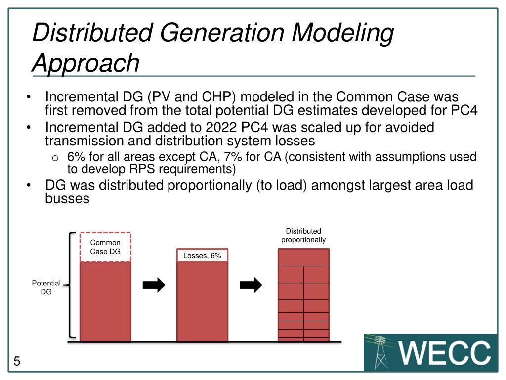 Distributed Generation Modeling Approach • Incremental DG (PV and CHP) modeled in the Common Case was first removed from the total potential DG estimates developed for PC4 • Incremental DG added to 2022 PC4 was scaled up for avoided transmission and distribution system losses • 6% for all areas except CA, 7% for CA (consistent with assumptions used to develop RPS requirements) • DG was distributed proportionally (to load) amongst largest area load busses Distributed proportionally Common Case DG Losses, 6% Potential DG