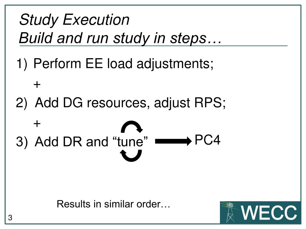 Study ExecutionBuild and run study in steps… • Perform EE load adjustments; + 2) Add DG resources, adjust RPS; + 3) Add DR and “tune” PC4 Results in similar order…