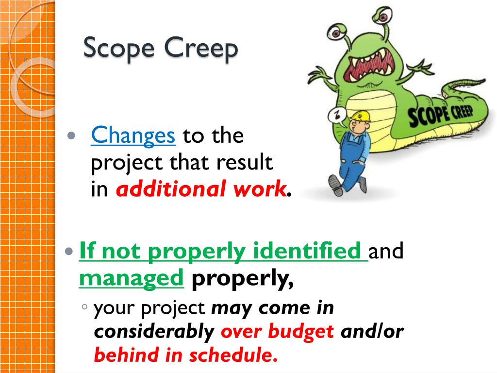 Scope Creep • Changes to the project that result in additional work. • If not properly identified and managedproperly, • your project may come in considerably over budget and/or behind in schedule.